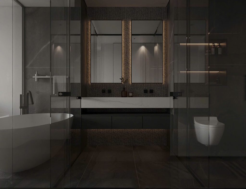 Không gian phòng tắm được tích hợp khéo léo với vách kính trong suốt, tạo sự kết nối trực quan giữa hai khu vực mà không làm mất đi tính riêng tư.
