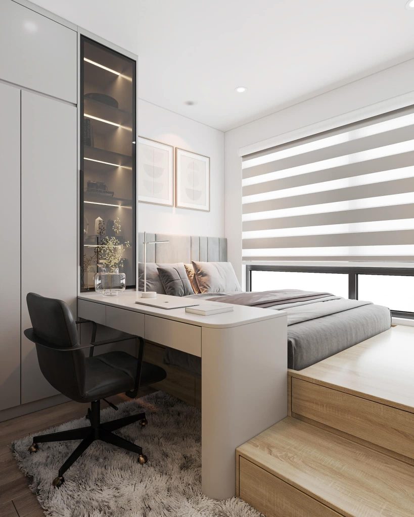 - Giường: Lựa chọn giường có ngăn kéo dưới để lưu trữ chăn gối, tiết kiệm không gian.