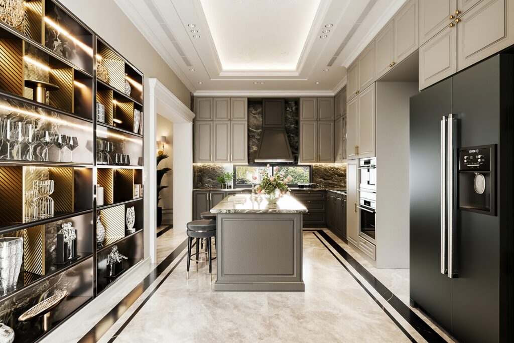 Thiết kế phòng bếp biệt thự theo phong cách hiện đại sẽ hướng đến tính thẩm mỹ và ưu tiên sử dụng những đồ dùng vật dụng nội thất thông minh. Trong những gian bếp hiện đại sẽ hạn chế nhưng chi tiết cầu kỳ nhằm đơn giản hóa kiến trúc mà vẫn tạo nên điểm nhấn sáng tạo cho không gian.