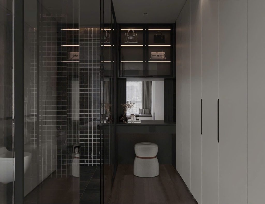 Không gian phòng tắm được tích hợp khéo léo với vách kính trong suốt, tạo sự kết nối trực quan giữa hai khu vực mà không làm mất đi tính riêng tư.