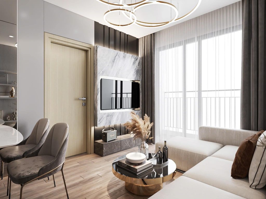 - Nội thất: Một bộ sofa kiểu dáng gọn gàng, bàn trà nhỏ và kệ tivi treo tường là những lựa chọn thông minh. Nếu không gian hạn chế, hãy sử dụng nội thất đa năng như sofa giường.