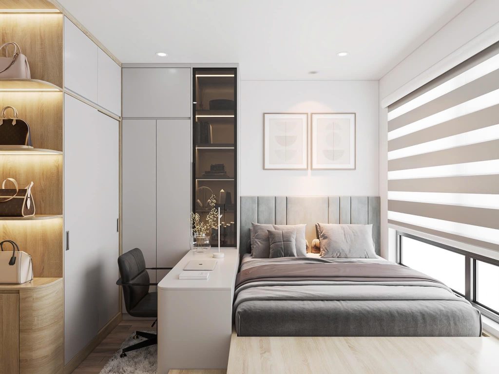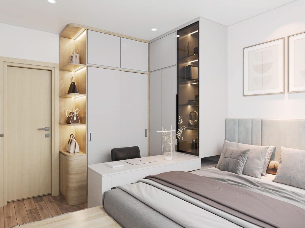 - Tủ quần áo: Dùng tủ cao kịch trần để tối ưu diện tích lưu trữ.