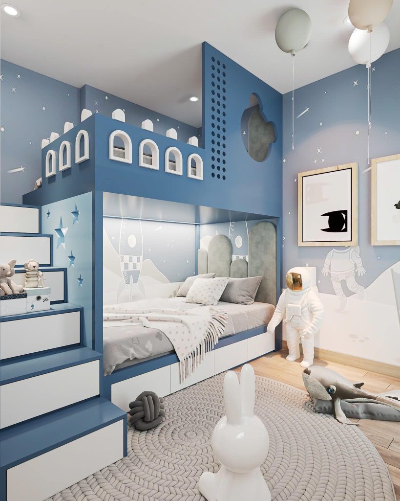 - Trang trí: Đèn ngủ dịu nhẹ, tranh tường hoặc giấy dán tường họa tiết đơn giản sẽ tạo cảm giác ấm cúng.