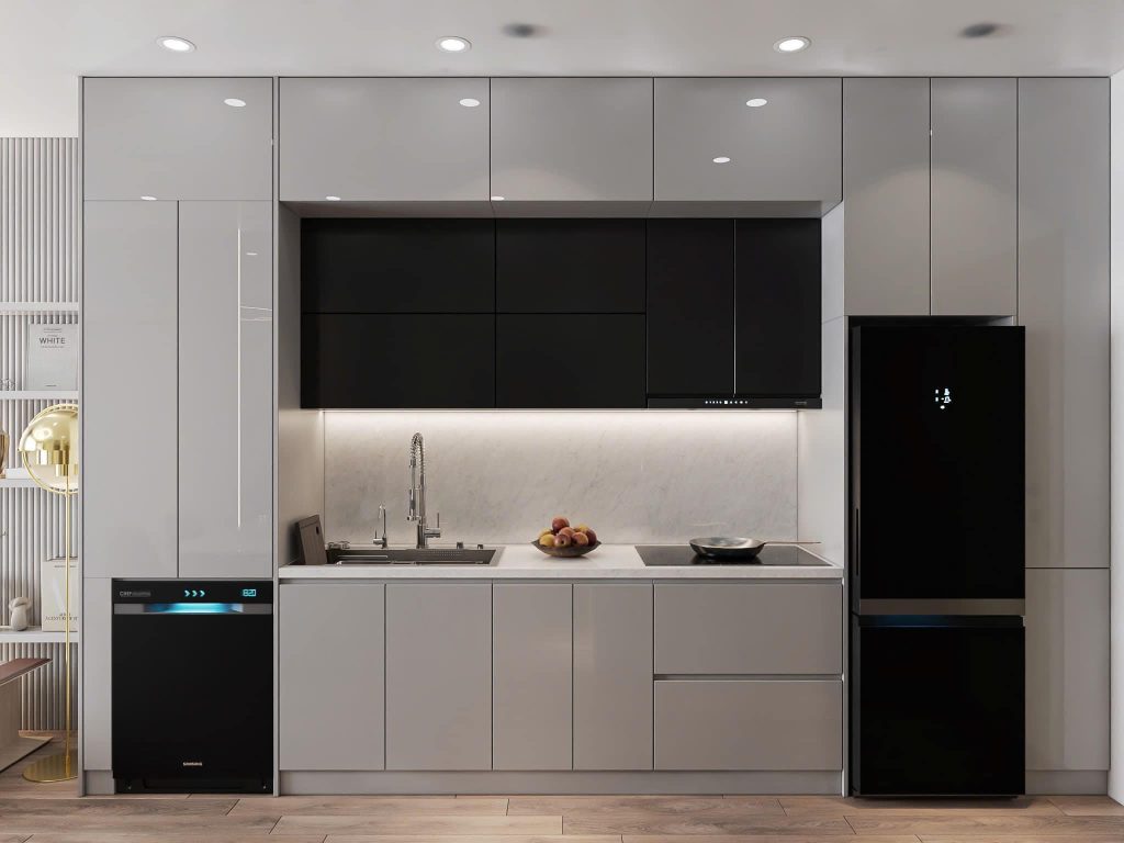 - Thiết bị: Sử dụng các thiết bị bếp tích hợp như bếp từ, lò vi sóng âm tủ để giữ không gian gọn gàng.